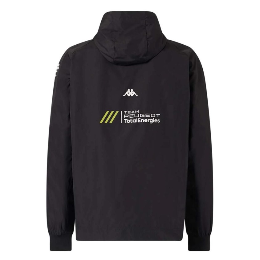 Made from 100% polyester fleece, it features an integrated hood, full zip front, side and chest pockets, and ribbed cuffs. Screen-printed logos (Kappa, Peugeot Sport, TotalEnergies, Capgemini) highlight the authentic racing identity.